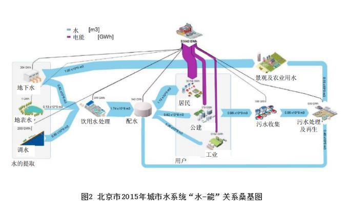 圖2所示給出了北京2015年水系統水量與能耗分配關系?;鶊D,可以評估城市“水足跡”過程及能量消耗,在城市尺度上系統評估和多目標優化“水-能”關系,通過水系統全流程過程系統規劃、聚焦水循環每個鏈條,進行傳統工藝改進、高效設備及革新性工藝技術應用,尤其是對排水系統結構優化進而提升系統能源利用效率,因地制宜地采用污水中資源、能量回收以及清潔能源提取和利用等技術措施,進一步降低水系統能耗和溫室氣體排放,對于提升水系統韌性及可持續至關重要。