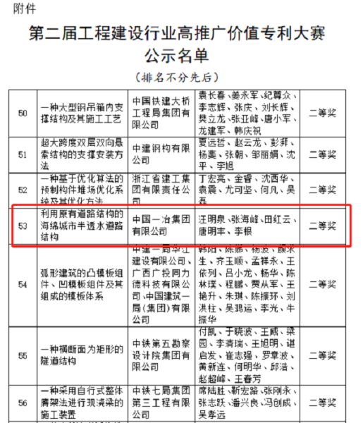近日,在中國施工企業(yè)管理協(xié)會舉辦的第二屆工程建設行業(yè)高推廣價值專利大賽上,中國一冶城建公司推薦的《利用原有道路結構的海綿城市半透水道路結構》專利技術榮獲二等獎。