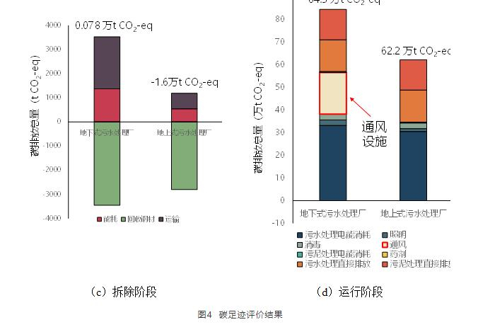 案例污水處理廠全生命周期碳足跡評價結果如圖4所示。地下廠全生命周期總碳排放量約87.1 萬t CO2-eq,較地上廠高36.5%,其中,運行階段碳排放量可達總量的95%以上。由于地下工程結構,地下廠在建設(圖6b)與拆除階段(圖6c)中,需要額外的施工量與建材消耗;在運行階段(圖6c),則需額外通風、照明等電力消耗。因此,地下廠運行階段(20年)總碳排放量較地上式高35.8%;其中,地下廠額外通風產生的碳排放量約18.4萬t CO2-eq,占總排放量的22%??梢?,地下式污水處理廠全生命周期中會產生大量碳排放,不符合碳減排、碳中和的社會發展方向。