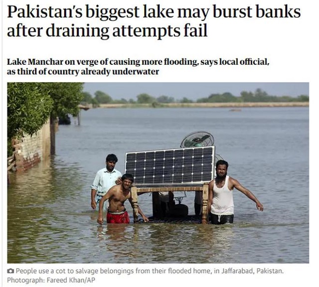 據《衛(wèi)報》9月5日報道,巴基斯坦一名高級官員警告說,該國最大淡水湖曼查爾湖瀕臨決堤。此前,巴基斯坦當局試圖以一種可控的方式排水,但以失敗告終。