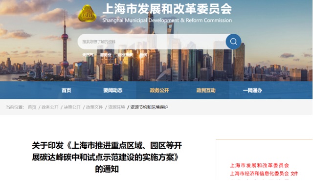上海市推進重點區(qū)域、園區(qū)等開展碳達峰碳中和試點示范建設的實施方案
