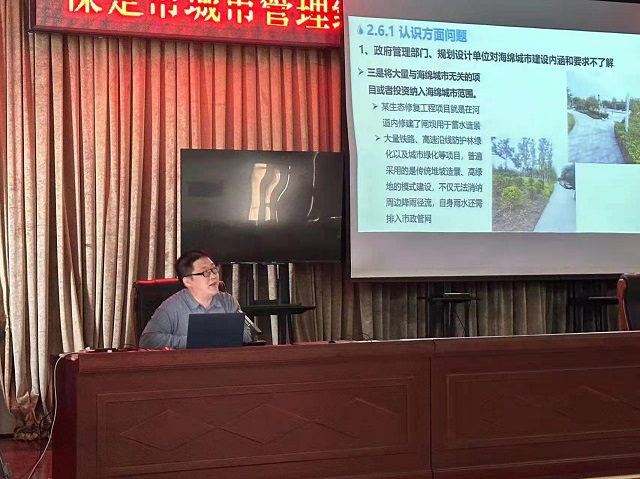 接著,馬洪濤教授針對規(guī)劃是基礎(chǔ),構(gòu)建全面科學(xué)的海綿城市規(guī)劃體系;方案是指引,編制合理系統(tǒng)的海綿城市實(shí)施方案;項(xiàng)目是根本,做好科學(xué)合理的海綿城市設(shè)計(jì)方案;機(jī)制是基礎(chǔ),構(gòu)建完整可行的海綿城市推進(jìn)機(jī)制;模式是保障,選擇綜合統(tǒng)籌的海綿城市建設(shè)模式;交流是助力,形成通俗易懂的海綿城市語言體系等方面,結(jié)合其他城市建設(shè)經(jīng)驗(yàn),針對保定實(shí)際,做了深入淺出、通俗易懂的細(xì)致講解。