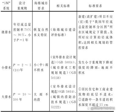 內(nèi)澇成因復(fù)雜,解決內(nèi)澇必須從問題產(chǎn)生的根源著手,運(yùn)用滯、蓄、排等技術(shù)手段,充分發(fā)揮基于海綿城市理念的“3M”系統(tǒng)效能,綜合治理(見表1)。源頭減排系統(tǒng)旨在恢復(fù)場(chǎng)地開發(fā)前自然水文特征,應(yīng)對(duì)低強(qiáng)度大概率(一般在1年一遇重現(xiàn)期以下)的中小降雨事件;小排水系統(tǒng)重點(diǎn)解決及時(shí)排除短時(shí)強(qiáng)降雨帶來的徑流量劇增,應(yīng)對(duì)較大概率的短歷時(shí)強(qiáng)降雨事件,一般在2——10年一遇降雨條件下達(dá)到“地面無積水”;大排水系統(tǒng)重點(diǎn)是對(duì)超標(biāo)徑流進(jìn)行合理蓄、排,應(yīng)對(duì)小概率的超強(qiáng)降雨 事 件,一般在10——100年一遇降雨條件下,滿足“大雨不內(nèi)澇”。海綿城市理論的系統(tǒng)性要求“3M”各系統(tǒng)之間在規(guī)劃設(shè)計(jì)、標(biāo)準(zhǔn)應(yīng)用、豎向控制等方面做好充分銜接,綜合發(fā)揮效能,應(yīng)對(duì)水生態(tài)與水安全問題。