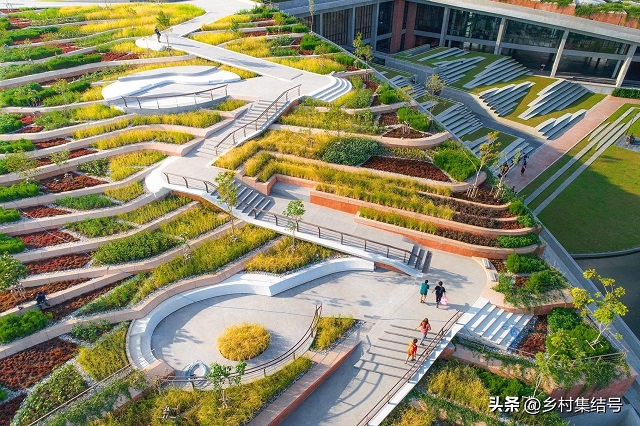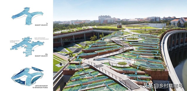 當(dāng)雨水擊中屋頂時(shí),首先農(nóng)作物的種植加強(qiáng)了土壤的肥沃度,減少了雨水期間的水土流失,并有效防止污染徑流和空氣中的毒素從排水系統(tǒng)和自然水體中進(jìn)入。多余的雨水會(huì)沿著斜坡蜿蜒而下,下一層梯田就會(huì)收集上一層的徑流,所到之處會(huì)形成獨(dú)特的小分水嶺群,幫助吸收、過濾和凈化雨水。