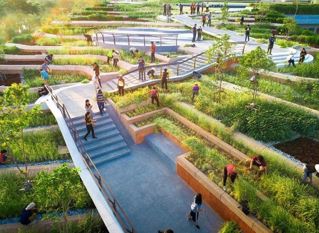 在景觀設(shè)計(jì)中,設(shè)計(jì)師試圖讓垂直建筑與食物來源產(chǎn)生重合,于是在受到了東南亞山區(qū)的傳統(tǒng)農(nóng)業(yè)實(shí)踐的獨(dú)創(chuàng)性啟發(fā)后,農(nóng)場采用了傳統(tǒng)水稻梯田的形式,結(jié)構(gòu)采用古老的夯土技術(shù)建造,并將其土方工程與現(xiàn)代綠色屋頂技術(shù)相結(jié)合,實(shí)現(xiàn)了現(xiàn)代景觀與傳統(tǒng)農(nóng)業(yè)的創(chuàng)意發(fā)展。相比傳統(tǒng)的混凝土屋頂,經(jīng)過層疊設(shè)計(jì)的梯田屋頂更能有效減緩多達(dá)20倍的雨水徑流。