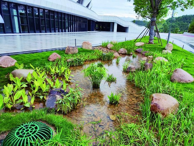 項(xiàng)目作為大型公共建筑,綠化灌溉和道路沖洗用水需求大。為減少自來水使用量,項(xiàng)目積極探索應(yīng)用智能化雨水回收利用系統(tǒng)。雨季利用建成的各類海綿設(shè)施,將雨水收集調(diào)蓄凈化后,通過自動化系統(tǒng)實(shí)現(xiàn)系統(tǒng)的智能運(yùn)行,回用于場地綠化澆灌和道路沖洗,極大地節(jié)省了水資源。