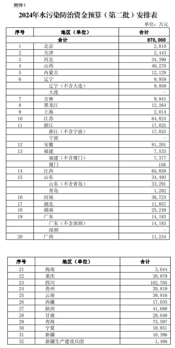 為促進水環境質量改善,加快推進水污染防治工作,現下達你省(自治區、直轄市、新疆生產建設兵團、計劃單列市,以下統稱省)2024年水污染防治資金(第二批),用于支持水污染防治和水生態環境保護等方面工作,并就有關事項通知如下: