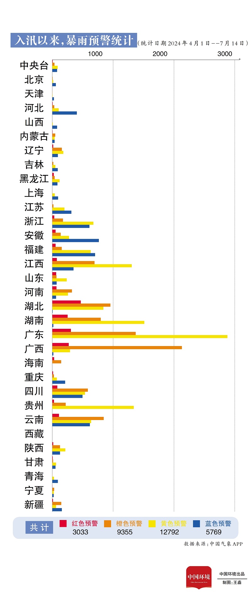 僅在6月份,南方地區(qū)經(jīng)歷了多輪強降雨天氣過程,中央氣象臺從6月10日開始連續(xù)21天發(fā)布暴雨預(yù)警,其中4天發(fā)布了最高級別的暴雨紅色預(yù)警。全國共發(fā)布紅色預(yù)警信息1969條,其中暴雨紅色預(yù)警信息占全部的45.7%,同比增加61.1%。