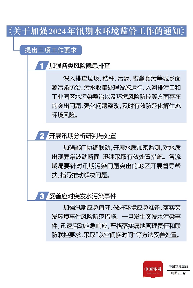 同時,極端降水對于環(huán)境風(fēng)險防控工作帶來不小的挑戰(zhàn)和壓力。目前,生態(tài)環(huán)境部對汛期環(huán)境監(jiān)管和突發(fā)環(huán)境事件應(yīng)對作出安排部署,印發(fā)《關(guān)于加強2024年汛期水環(huán)境監(jiān)管工作的通知》,要求各地進(jìn)一步加強汛期水環(huán)境監(jiān)管,防范汛期水環(huán)境質(zhì)量惡化以及發(fā)生重大水污染事件,切實保障飲水安全。生態(tài)環(huán)境部生態(tài)環(huán)境應(yīng)急辦主任李天威表示,明確要求各地參考國控斷面歷年汛期水質(zhì)數(shù)據(jù)和集中式飲用水水源地水源環(huán)境狀況調(diào)查評估的情況,確定本行政區(qū)域汛期重點關(guān)注斷面和飲用水水源地,識別斷面匯水范圍內(nèi)影響水質(zhì)以及飲水安全的主要污染源。