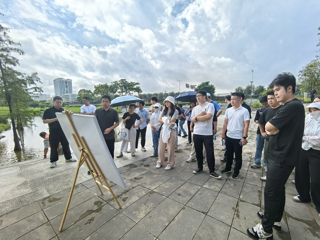 第一階段活動為現(xiàn)場調(diào)研。參加活動的人員現(xiàn)場觀摩了光明區(qū)典范海綿城市建設(shè)項目——樓村濕地公園。區(qū)海綿辦工作人員介紹了光明區(qū)海綿城市建設(shè)歷程,并結(jié)合樓村濕地公園介紹光明區(qū)如何從場地豎向、地表組織徑流、雨洪調(diào)蓄等方面打造精品海綿城市項目。區(qū)節(jié)水辦工作人員介紹了近年來光明區(qū)節(jié)水與再生水工作的舉措和成效,以樓村濕地公園成功創(chuàng)建節(jié)水型公園和再生水取水樣板站為案例,介紹公園再生水處理流程、取水方式及再生水用于園區(qū)綠化澆灑等情況。區(qū)環(huán)境水務(wù)有限公司工作人員結(jié)合水情教育基地,詳細介紹了光明區(qū)水務(wù)工作各板塊發(fā)展進程、近年來取得的成就及面臨的挑戰(zhàn),并強調(diào)節(jié)水與水資源保護的重要性。