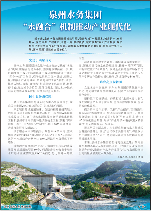 近年來,泉州水務集團堅持黨建引領,穩(wěn)步形成“水利原水、城鄉(xiāng)供水、市政排水、生態(tài)環(huán)保、工程建設、水務大腦、股權投資、城市服務”八大產(chǎn)業(yè)板塊,現(xiàn)代化水平走在全國水務行業(yè)前列。現(xiàn)擁有各類權屬企業(yè)107家,先后獲評第十三屆、第十四屆“福建省文明單位”。