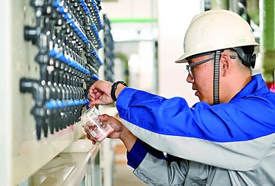 天津南港工業區一海水淡化主裝置生產車間內,工作人員在取樣淡水。新華社發