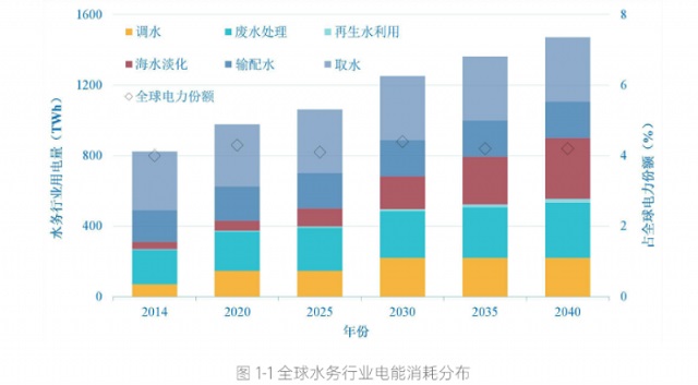 而污水處理不僅是水質(zhì)凈化的過程,也是實(shí)現(xiàn)碳中和的重要組成部分。從能耗強(qiáng)度來看,城鎮(zhèn)水務(wù)一直被冠以能源密集型、高耗能行業(yè)。根據(jù)國際能源機(jī)構(gòu)/IEA數(shù)據(jù),水務(wù)行業(yè)耗電量(包括了遠(yuǎn)距離調(diào)水和海水淡化)占到全球總耗電量的4%至6%,取水、污水處理和輸配水是耗電量最高的3個(gè)環(huán)節(jié)。
