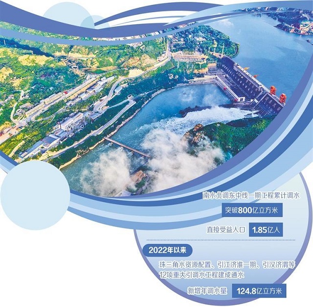 水利部規(guī)劃計劃司司長張祥偉介紹,目前,南水北調(diào)東中線一期工程累計調(diào)水突破800億立方米,直接受益人口達1.85億人。2022年以來,珠三角水資源配置、引江濟淮一期、引漢濟渭等12項重大引調(diào)水工程建成通水,新增年調(diào)水量124.8億立方米;西江大藤峽、新疆大石門等24座大型水庫建成投用;新開工的黃河古賢水利樞紐等31項流域防洪控制性工程和重點水源工程建成后可新增供水能力49億立方米。